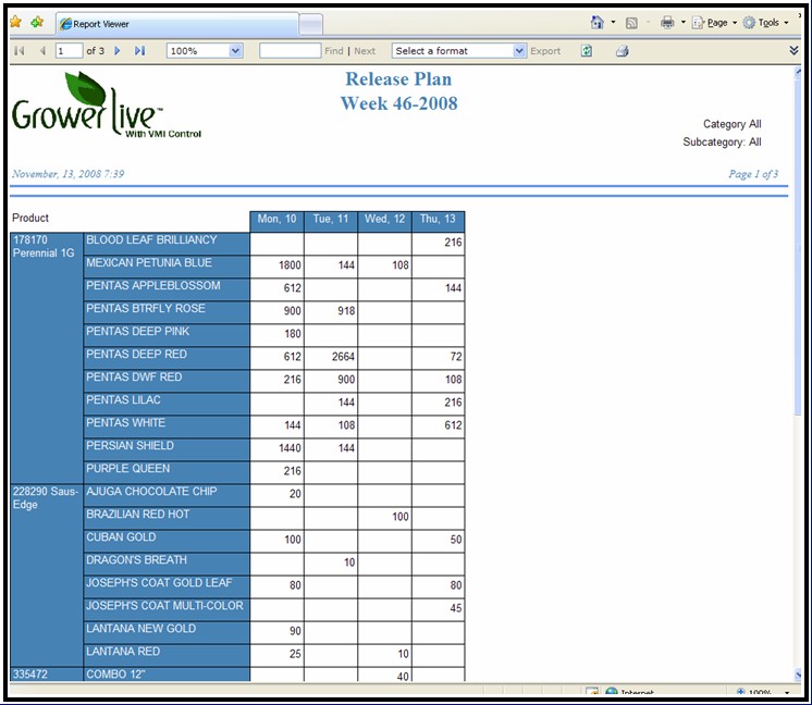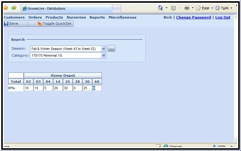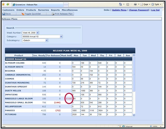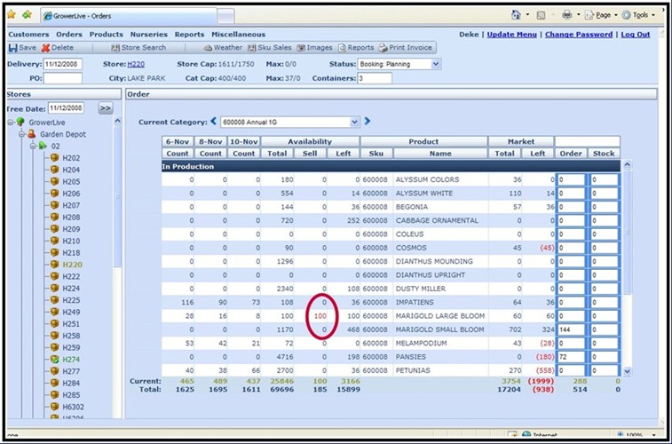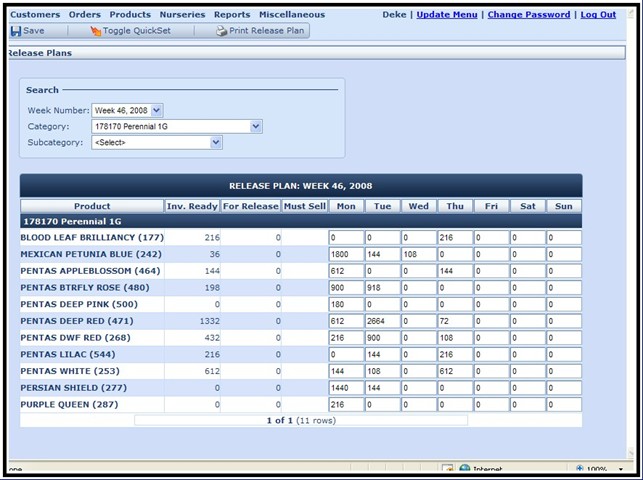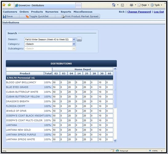Manage your available inventory efficiently by identifying product “Ready Dates,” and identify available products as they become ready to sell. Through the use of any internet capable device, growers can walk the farm and count only what is ready for sale. Management can then release all or part of the available quantities for sale at once, or over a period of days. Release quantities can be based on a seasonal distribution plan that allows the order writer to see only what percentage of the availability is allocated to the current customer, or market they are working on. This information is immediately available to the order writers.